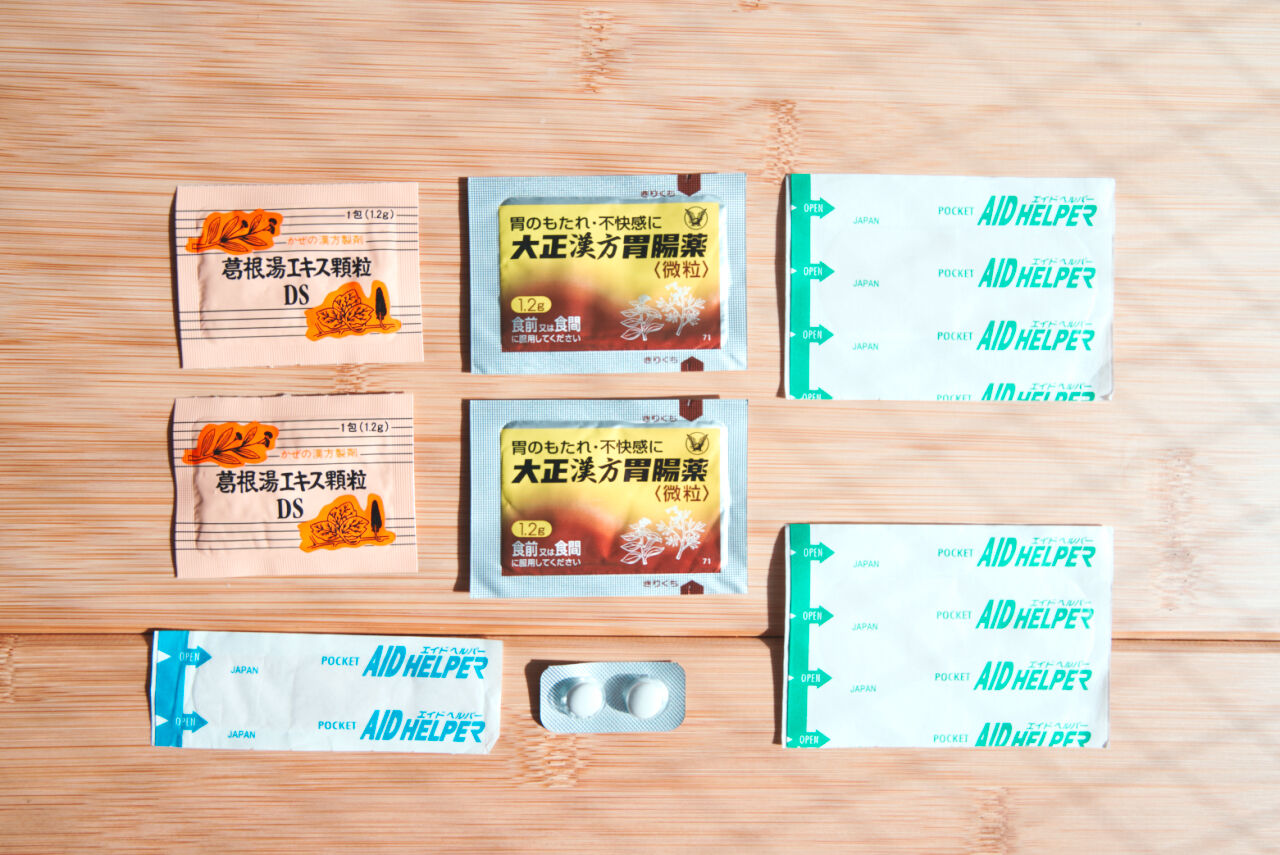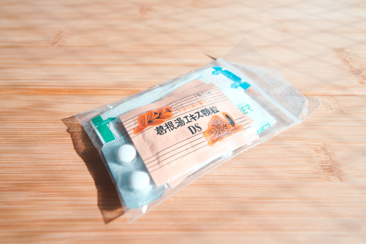 常備薬は、【痛み止め・胃腸薬・絆創膏・葛根湯】葛根湯は微妙なラインですが、常に持っているのものなので非常時以外にも使えるかなと入れています。