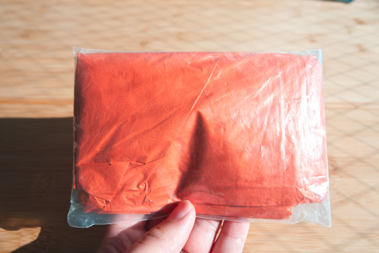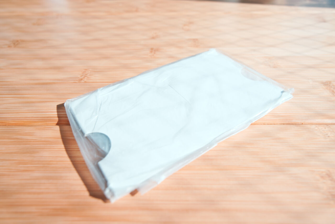 小さいチャック付きポリ袋に折り畳んで2枚入れてます。汚れてしまった時や破れてしまった時の交換用です。