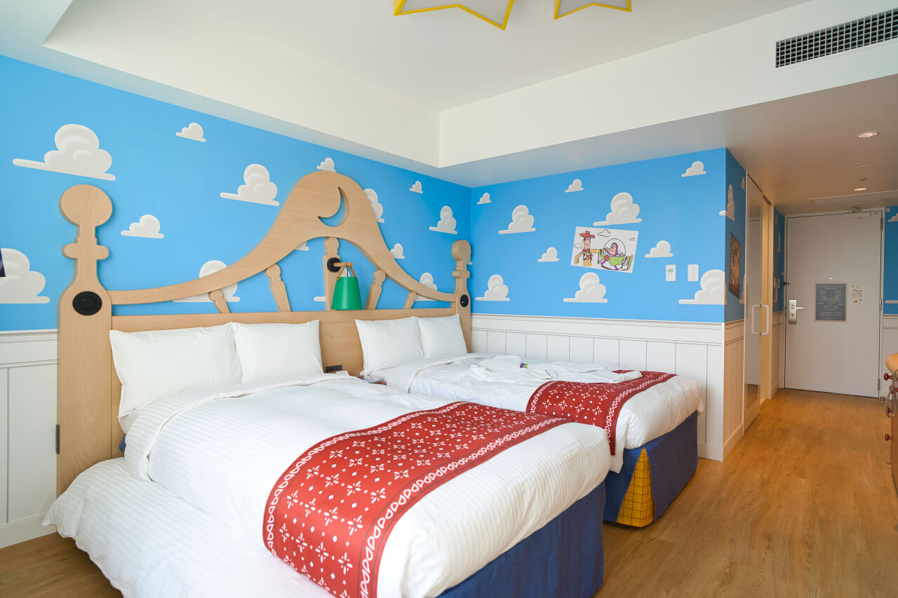 スタンダードルーム(575室)とスーペリアルーム(20室)からなる全595室は、映画『トイ・ストーリー』シリーズ第1作に登場するアンディの部屋をイメージしており、青い空と白い雲の壁紙や壁に掛けられたミッキーマウスの大きな腕時計など、おもちゃを思わせる備品や調度品などが置かれています。